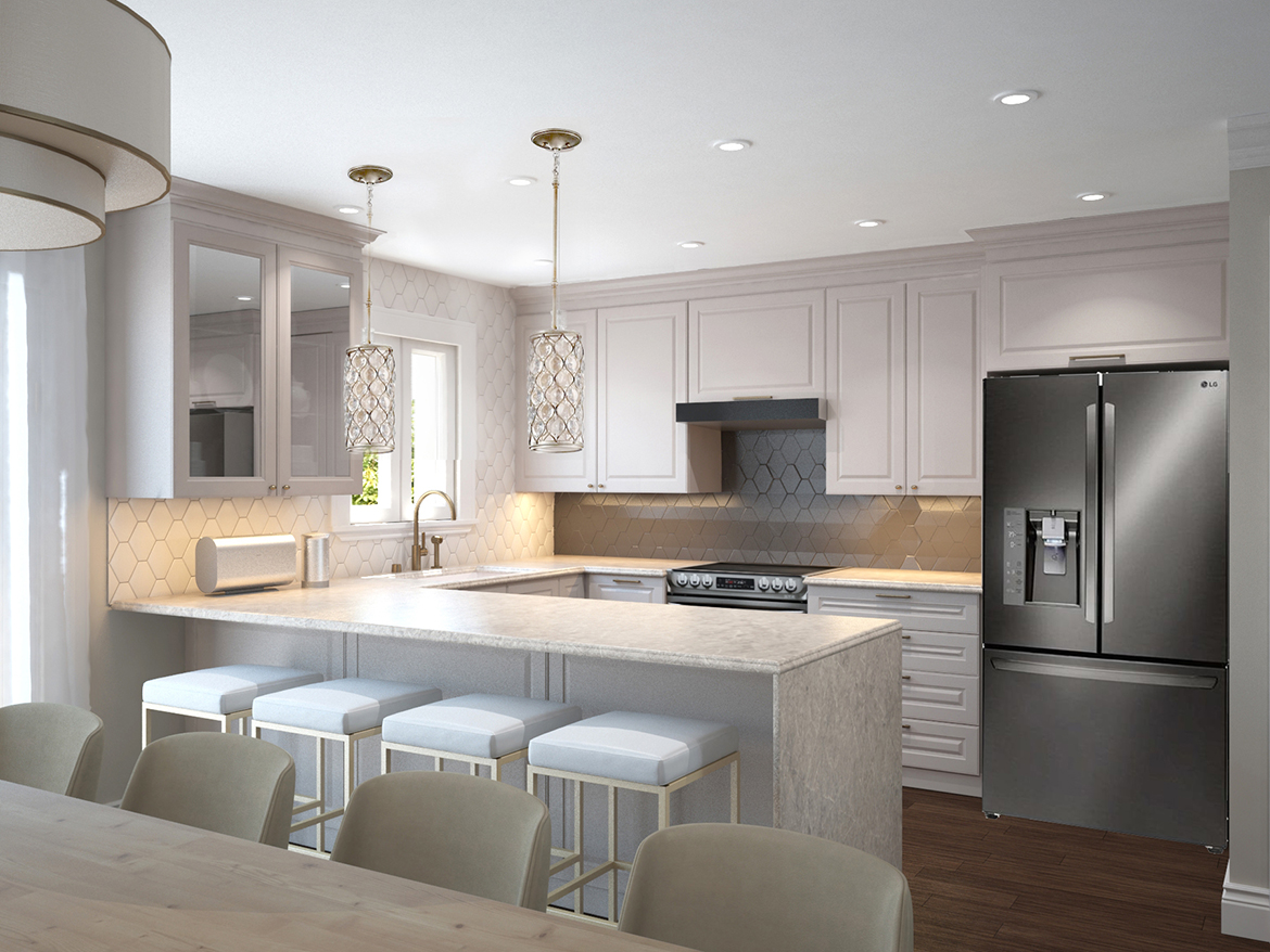 Custom kitchen cabinets go up to the ceiling, we added a peninsula with seating of 4 on one side and great prep area on another.